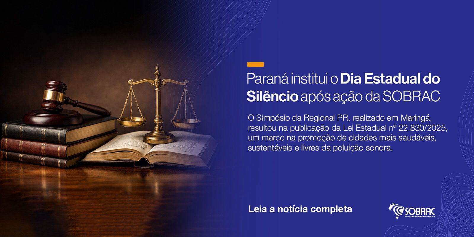 A SOBRAC – Sociedade Brasileira de Acústica celebra uma importante conquista da sua Regional Paraná: a publicação da Lei Estadual nº 22.830, de 27 de novembro de 2025, que dispõe sobre a promoção do direito a cidades limpas, saudáveis e sustentáveis, livres de poluição sonora, e institui o Dia Estadual do Silêncio, a ser celebrado anualmente em 7 de maio.